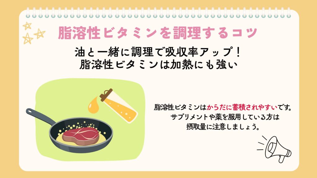 水溶性ビタミンと比べて加熱に強いため、加熱調理で栄養が損なわれにくいのも嬉しいポイントです。